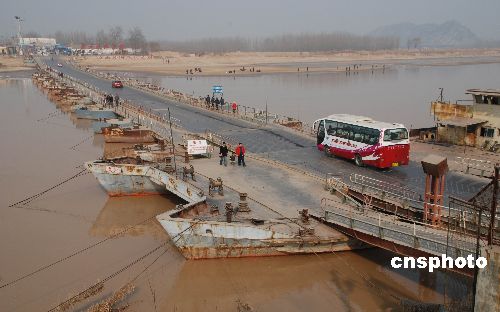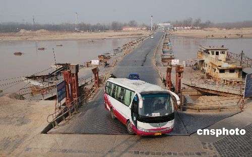 2009年1月29日,車輛從剛恢復(fù)通車的濼口浮橋上通過(guò)。由于近期氣溫回升,黃河濟(jì)南段流凌密度降至10%以下,截至上午8時(shí),濼口段流量保持在248立方米/秒以下,持續(xù)一個(gè)多月的凌汛已經(jīng)大幅度緩解。據(jù)濟(jì)南黃河防汛辦公室專家稱,近期黃河下游不會(huì)形成嚴(yán)重凌汛。濼口浮橋下游的章丘、歷程、濟(jì)陽(yáng)有10段封河,封河長(zhǎng)度在25公里左右。中新社發(fā) 滕越 攝