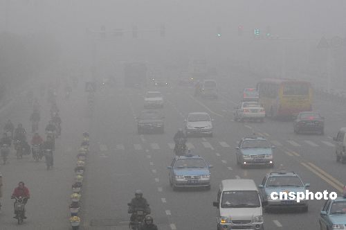 2009年2月1日,江蘇淮安街頭被大霧籠罩。當(dāng)日是節(jié)后上班的第一天,也是農(nóng)民工返城的高峰期,大霧給春運產(chǎn)生一定的影響。中新社發(fā) 賀敬華 攝