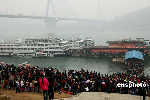 2月3日農(nóng)歷正月初九早8時(shí),長江宜昌港大公橋客運(yùn)碼頭四條躉船無一客人、無一客船,9時(shí),9艘客船同一船閘、同時(shí)停泊宜昌港,一時(shí)間,涌入宜昌港口的出川大軍疏散成“井噴”之勢。宜昌海事、公安、港口等部門聯(lián)動(dòng)執(zhí)法,35分鐘時(shí)間內(nèi)緊急疏散4500余人,全部是出川農(nóng)民工。據(jù)統(tǒng)計(jì),三峽春運(yùn)期間,常年旅客進(jìn)出客流量約50萬人次,其中外出農(nóng)民工乘船超過40余萬人次。據(jù)悉,三峽庫區(qū)是長江干線跨省春運(yùn)重點(diǎn)航線,而這一航線又是中國內(nèi)河農(nóng)民工乘船的專營航線,節(jié)前單邊返鄉(xiāng)過年,節(jié)后單邊出川進(jìn)城打工,客船單邊旅客、客船高度集中,是中國內(nèi)河不多見的春運(yùn)現(xiàn)象。中新社發(fā) 望作信 攝