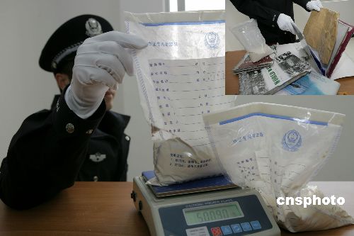 二月三日,福州海關(guān)緝私警察展示新繳獲的毒品海洛因。連日來,福州海關(guān)駐長樂機(jī)場辦事處旅檢關(guān)員在對吉隆坡-廣州-福州航班進(jìn)行監(jiān)管時,連續(xù)查獲三起東南亞籍旅客涉嫌走私毒品入境案件,共繳獲毒品海洛因凈重四千六百七十七點(diǎn)六克,抓獲犯罪嫌疑人三名。中新社發(fā) 陳多 攝
