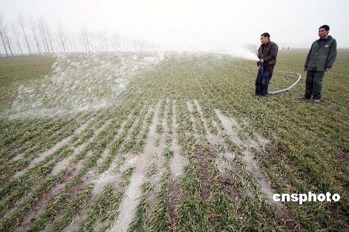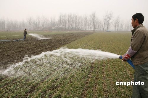 2月3日,安徽蒙城縣許疃鎮(zhèn)趙集村村民在澆灌麥田。2月2日,安徽蒙城氣象臺(tái)再次發(fā)布干旱紅色預(yù)警信息,針對(duì)當(dāng)前日益嚴(yán)重的旱情,安徽省蒙城縣再次掀起抗旱保苗的高潮,努力把旱災(zāi)損失降到最低限度。蒙城縣是全國(guó)糧食生產(chǎn)先進(jìn)縣,全縣小麥種植面積達(dá)165萬(wàn)畝,自10月下旬以來(lái),該縣已連續(xù)百日無(wú)有效降雨,土壤墑情迅速下降,加上連續(xù)發(fā)生三次寒潮,干旱和霜凍疊加在一起,致使小麥苗情不斷惡化,對(duì)越冬小麥生長(zhǎng)極其不利,形勢(shì)十分嚴(yán)峻。面對(duì)旱情,蒙城縣上下積極行動(dòng),分別于去年12月中旬、1月上、中旬三次掀起抗旱保苗高潮,努力把旱災(zāi)損失降到最低限度。中新社發(fā) 胡衛(wèi)國(guó) 攝