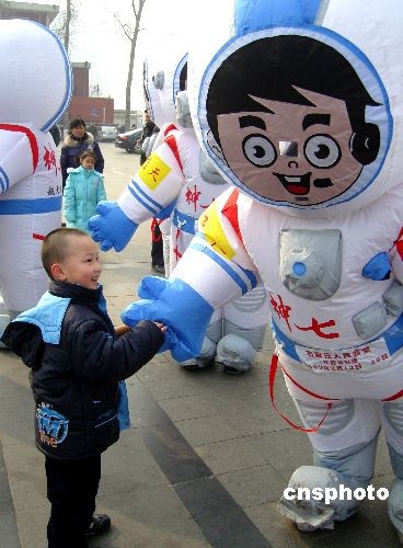 2月4日,《飛天壯歌——中國(guó)首次太空漫步航天展》新聞發(fā)布會(huì)現(xiàn)場(chǎng),河北兒童與扮成“航天員”的工作人員握手!讹w天壯歌——中國(guó)首次太空漫步航天展》全國(guó)巡展即將于2月13日在河北省石家莊市啟動(dòng)。主辦方稱,這是中國(guó)航天史上規(guī)模最大、規(guī)格最高的航天尖端科技成就展,將有大量神七航天實(shí)物現(xiàn)場(chǎng)展出,包括神七宇宙飛船返回艙、價(jià)值三千萬(wàn)元人民幣的宇航員艙外航天服、火箭整流罩殘骸,以及翟志剛遨游太空出艙時(shí)揮舞的國(guó)旗等重要實(shí)物。中新社發(fā) 牛琳 攝