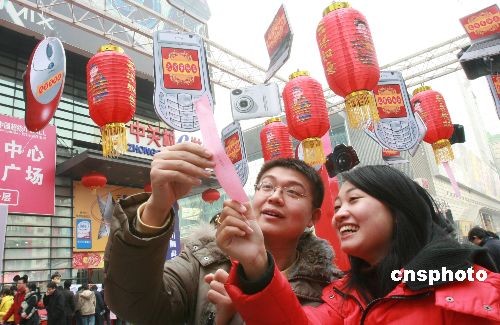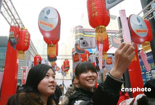2月8日,人們?cè)诒本┲嘘P(guān)村競(jìng)猜謎語(yǔ)。為迎接元宵佳節(jié),北京中關(guān)村舉行元宵燈謎會(huì),用“電腦”、“相機(jī)”、“鼠標(biāo)”、“手機(jī)”等造型懸掛的燈謎,吸引了不少市民駐足猜謎。中新社發(fā) 陳曉根 攝