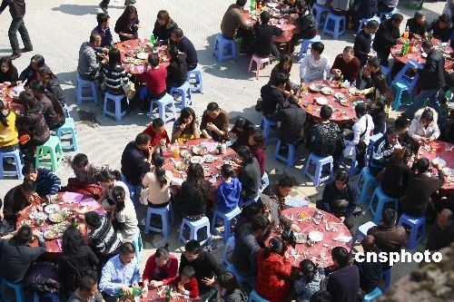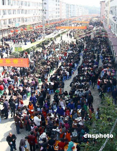 圖為位于雅陽的兩千多桌宴席。2月9日,中國傳統的元宵節(jié),在浙江省泰順縣,在這一天就會邀請四方的賓客相聚在洲嶺、雅陽、西旸等地。今年雅陽的“百家宴”歷史以來規(guī)模也是最大的一次,達到一千多桌,一萬多人,且和文化旅游相組合,推出了許多的節(jié)目,F在,“百家宴”已經成為一種帶有民間聯誼性質的活動,人們歡聚一堂聯絡感情,互送祝福,譜寫盛世和諧新篇章。中新社發(fā) 鎬璽 攝
