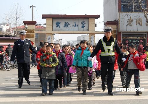 2月10日,交通民警護送小學生安全過馬路。當日是山東省棗莊市各中小學開學首日,棗莊市臺兒莊區(qū)公安交警大隊在中小學門前設立“護校崗”,增派警力負責指揮疏導學校門前的交通秩序,護送上下學的廣大師生安全過馬路,保證了轄區(qū)廣大中小學生高高興興上學,平平安安回家。中新社發(fā) 高啟民 攝