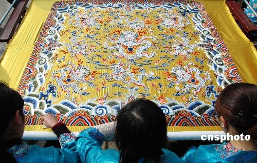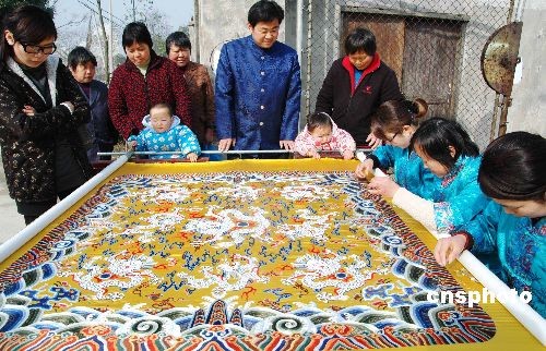 2009年2月10日,一幅長(zhǎng)117.5厘米、寬132厘米,使用了18萬(wàn)顆直徑1.3毫米珍珠“繡”制的《織繡串珍珠九龍皇墊》在蘇州高新區(qū)東渚鎮(zhèn)繡制完成。此作品由4個(gè)繡娘費(fèi)時(shí)7個(gè)月制作完成,在1.5米乘1.5米的手工云錦底布上,共使用了純金線3000米,真絲花線2000克和18萬(wàn)顆珍珠。中新社發(fā) 朱子寒 攝