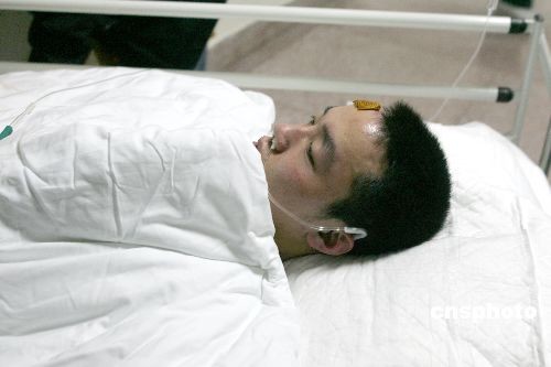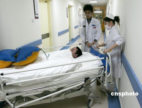 2月10日,6名在央視火災(zāi)事故中受傷的消防官兵在朝陽醫(yī)院接受治療。9日晚,中央電視臺新址北配樓突發(fā)火災(zāi),造成至少1人死亡7人受傷。據(jù)朝陽醫(yī)院總指揮閆勇介紹,9日晚21時20分到10日凌晨,該院共接收7名傷員,其中1名傷員于10日凌晨1時40分左右因搶救無效死亡,其他傷員病情穩(wěn)定。他表示,10日上午又有一名輕傷員轉(zhuǎn)至該院。圖為其中一名消防官兵被推出病房,接受檢查治療。中新社發(fā) 富田 攝