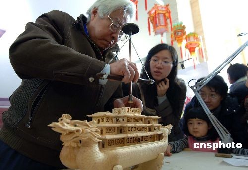 2月14日,在北京農(nóng)展館舉辦的“中國非物質(zhì)文化遺產(chǎn)傳統(tǒng)技藝大展”上,來自湖北武漢的木雕船模大師龍從發(fā),現(xiàn)場為北京觀眾表演用黃楊木制作龍鳳舟模型。中新社發(fā) 鄒憲 攝