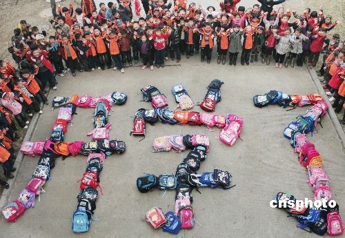 2月15日,外來務工人員子女專門學校——山東臨沂商城實驗學校的小學生用五顏六色的書包擺出“ 開學了”的字樣造型,歡呼慶祝新學期開學。中新社發(fā) 王立勝 攝