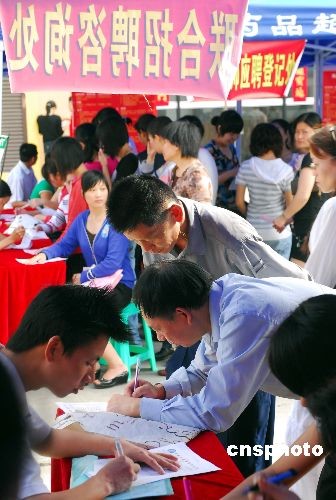 2009年2月16日,海南省就業(yè)局聯(lián)合大型零售企業(yè),在海口、三亞、澄邁等全省8個市縣同時舉行針對弱勢群體的大型現(xiàn)場招聘會,專門招收下崗職工、失業(yè)人員、零就業(yè)家庭人員、大中專畢業(yè)待業(yè)青年和農(nóng)民工。用人單位對聘用人員一律進行培訓上崗,無論哪個工種的工資,都不低于所在市縣的最低生活保障金,且到崗就給購買各項保險。中新社發(fā) 善平 攝