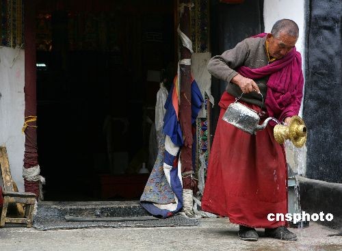 2月24日是藏歷大年三十,哲蚌寺內(nèi)的一位老僧人正在清洗新年用的佛教禮器。中新社發(fā) 劉震 攝