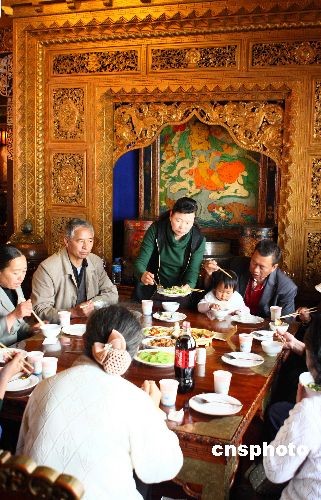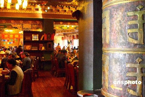 隨著在昆明定居的藏族民眾越來越多,獨(dú)具特色的藏族飲食也越來越受到昆明市民的喜愛,酥油茶、青稞酒和牦牛肉這些來自藏區(qū)的綠色食品更是受到熱捧。圖為藏歷新年期間,昆明最有名的“瑪吉阿米香格里拉風(fēng)情宮”藏式餐廳人滿為患,昆明市民紛紛到此感受藏歷新年的別樣風(fēng)情。中新社發(fā) 劉冉陽 攝