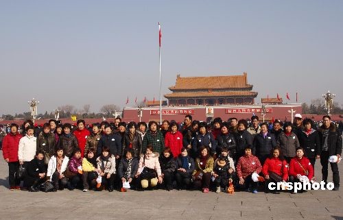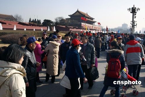 2月27日,全國“兩會”召開前,北京天安門前噴泉開放,各地游客如織。中新社發(fā) 鄭雄增 攝