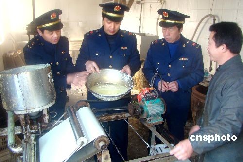 2月27日,江蘇連云港市連云工商分局執(zhí)法人員突擊行動,在連云區(qū)院前路當(dāng)場端掉正在生產(chǎn)豆腐的兩個黑窩點。工商執(zhí)法人員當(dāng)即查封了這兩家豆腐作坊,封存了生產(chǎn)工具,并責(zé)令限期整改。中新社發(fā) 王春 攝