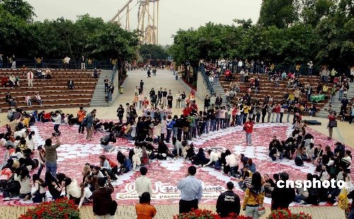 三月一日,為慶!叭恕眿D女節(jié)的即將到來,三百多名女士齊聚廣州長隆歡樂世界挑戰(zhàn)“人肉多米諾”骨牌。圖為蝴蝶形狀的骨牌圖案逐漸散開,場(chǎng)面壯觀。中新社發(fā) 劉衛(wèi)勇 攝