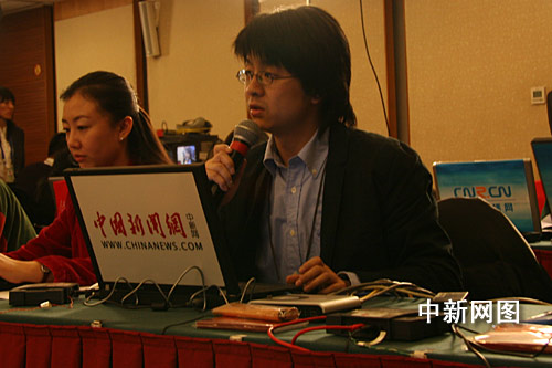 3月5日晚8時(shí),“兩會(huì)”新聞中心邀請(qǐng)了5位出席十一屆全國(guó)人大二次會(huì)議的代表,與網(wǎng)民在線交流如何應(yīng)對(duì)國(guó)際金融危機(jī)的挑戰(zhàn)。圖為中新網(wǎng)記者代表網(wǎng)友向5位代表提問(wèn)。中新網(wǎng)記者 吳博 攝
