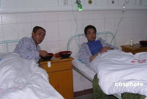 3月6日,河北武安金銘煤礦發(fā)生爆炸事故,14名當(dāng)班工人被困井下。經(jīng)救援人員全力搜救,目前已有10名被困人員獲救升井,另有2人遇難2人失蹤。圖為在當(dāng)?shù)蒯t(yī)院入院觀察的礦難幸存者徐從軒(左)和他的工友。中新社發(fā) 牛琳 攝