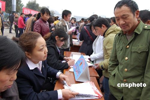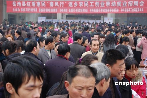 為解決農民工就業(yè)難的問題,3月9日,四川岳池舉辦“紅盾惠民春風行”返鄉(xiāng)農民工創(chuàng)業(yè)帶動就業(yè)招聘會,上萬名農民工前往應聘。共有41個單位參與招聘,提供就業(yè)崗位3400余個。中新社發(fā) 胡佐斌 攝