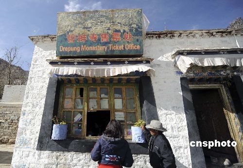 3月10日,游人在西藏拉薩哲蚌寺售票處購(gòu)買(mǎi)參觀票。當(dāng)日,哲蚌寺推出半價(jià)門(mén)票。中新社發(fā) 廖攀 攝