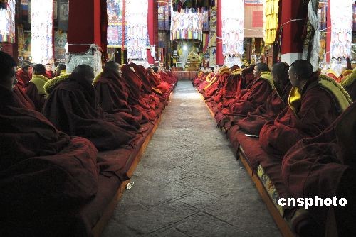 3月10日,西藏拉薩哲蚌寺,僧人們?cè)诖霘J大殿誦經(jīng)。中新社發(fā) 廖攀 攝