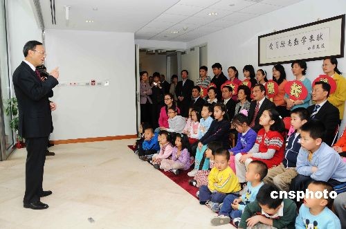 當(dāng)?shù)貢r(shí)間三月十二日,正在美國(guó)訪問(wèn)的中國(guó)外交部部長(zhǎng)楊潔篪來(lái)到中國(guó)駐美大使館視察中國(guó)250多家駐外使領(lǐng)館中的一所學(xué)!v美使館陽(yáng)光學(xué)校。楊潔篪在和學(xué)校孩子們交談時(shí)鼓勵(lì)他們學(xué)說(shuō)中國(guó)話,學(xué)寫(xiě)中國(guó)字,學(xué)做中國(guó)人,并為陽(yáng)光學(xué)校題寫(xiě)校訓(xùn):“愛(ài)國(guó)勵(lì)志勤學(xué)奉獻(xiàn)”。圖為楊潔篪在和陽(yáng)光學(xué)校老師和孩子們交流中。 中新社發(fā) 邱江波 攝