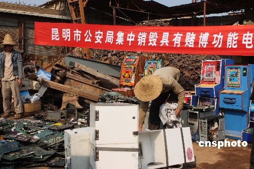 三月十三日,昆明市公安局集中銷毀賭博性游戲機(jī)及電路板共1560件,價值上百萬元人民幣。這種賭博游戲機(jī)通過無線收發(fā)器來控制內(nèi)部的電腦,達(dá)到操縱賭博結(jié)果的目的。圖為被銷毀的賭博游戲機(jī)。中新社發(fā) 劉冉陽 攝