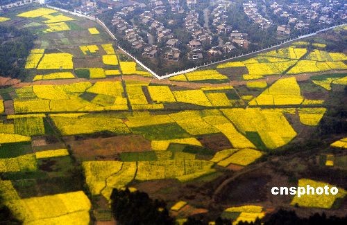 3月18日,從飛機(jī)上俯瞰成都平原,田野里盛開的油菜花美如油畫。中新社發(fā) 廖攀 攝