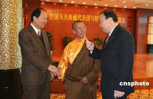 正在美國訪問的中國全國人大西藏代表團18日與紐約當?shù)貎S學界舉行座談,相互交流。圖為代表團團長、全國人大代表、西藏自治區(qū)人大常委會副主任新雜·單增曲扎活佛(中)與紐約當?shù)貎S領(lǐng)親切交談。中新社發(fā) 魏晞 攝