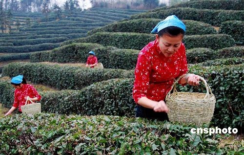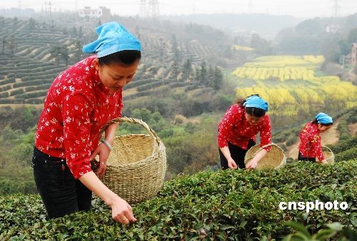 3月19日,廬山云霧茶各生產(chǎn)基地開始采摘新茶。這也意味著品質(zhì)最好的廬山云霧茶新茶“明前茶”將開始進入市場。廬山云霧茶因日照霧薰,其味清香異常,經(jīng)久不散,是中國有名的特種茶,以“味醇、色秀、香馨、液清”而久負盛名,連續(xù)兩屆獲中國國際茶業(yè)博覽會金獎。中新社發(fā) 胡國林 攝
