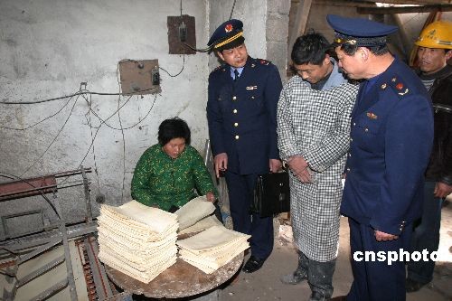 3月19日,江蘇連云港墟溝工商所在連云區(qū)城鄉(xiāng)結(jié)合部簡(jiǎn)明平房查處一無(wú)證煎餅黑作坊。執(zhí)法人員現(xiàn)場(chǎng)發(fā)現(xiàn),原料庫(kù)內(nèi)堆放著做煎餅的原料,原料包裝物上沒(méi)有任何標(biāo)志,無(wú)合格證。加工間狹小、設(shè)備簡(jiǎn)陋,隱蔽在簡(jiǎn)易破舊的平房?jī)?nèi),做飯、加工于一體。場(chǎng)所內(nèi)兩口盛面糊的大缸周圍污穢不堪,污水遍地,衛(wèi)生狀況十分惡劣。煎餅主要送往城區(qū)市場(chǎng)、學(xué)校周邊及工業(yè)區(qū)外來(lái)人員上班經(jīng)過(guò)的地方銷售。執(zhí)法人員當(dāng)即責(zé)令煎餅作坊停止生產(chǎn),并對(duì)加工機(jī)器予以查封。中新社發(fā) 王健民 攝