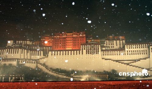 3月19日晚,拉薩市下起瑞雪,夜幕下,銀裝素裹的布達(dá)拉宮分外美麗。中新社發(fā) 杜洋 攝