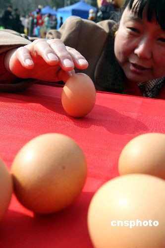 三月二十日,是中國二十四節(jié)氣中的春分。北京春分朝陽民俗文化藝術(shù)節(jié)閃亮登場,民眾紛紛“豎”雞蛋迎春分!按悍值剑皟呵巍,中國春分時節(jié)的“豎蛋游戲”,目前已成為世界性的游戲。中新社發(fā) 任海霞 攝