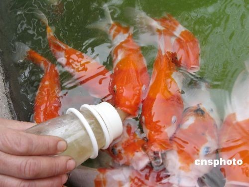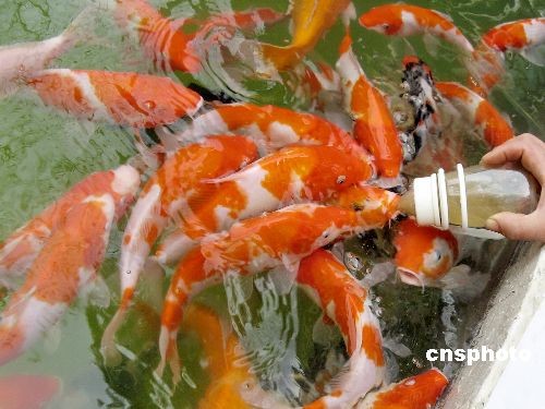 3月25日,在湖北宜昌公園,用奶瓶進(jìn)食的“吃奶魚(yú)”引來(lái)許多市民圍觀。該魚(yú)是原產(chǎn)日本的錦鯉,壽命在百歲以上,奶瓶裝的是高檔飼料。中新社發(fā) 韓玉洪 攝
