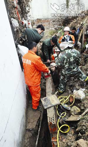 為保證被困人員安全同時(shí)防止第二次塌方,消防員迅速找來四根粗大的木料,將周邊松動(dòng)的水泥墻死死頂住。實(shí)施救援時(shí),消防員首先嘗試用風(fēng)鎬鑿碎溝底的水泥管,幾分鐘后很快鑿穿,不料余師傅的右腿依然動(dòng)彈不得;接著找來兩個(gè)氣墊,通過腳踩增壓,以求擴(kuò)大余師傅右腿所在的空間,結(jié)果效果不理想;繼而又找來千斤頂,還是無濟(jì)于事。發(fā)現(xiàn)只有吊起坍塌的墻體,才能從根本上解決問題。于是調(diào)來吊車,隔著院墻伸出吊臂,正好坍塌墻體上有個(gè)排水孔,消防員設(shè)法將鋼絲繩繞過了排水洞。吊車司機(jī)小心翼翼地操作,既要減輕被夾者的痛苦,又要繞過坍塌現(xiàn)場(chǎng)的線纜,而且盡可能在起吊過程中確保墻體不能斷裂。幸好,起吊墻體四周泥土較為松軟,11時(shí)20分左右,墻體被成功吊起,消防戰(zhàn)士迅速將余師傅抱出水溝。劉蔚丹 饒純武 黃康 攝
