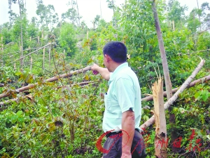 “半夜聽到呼呼的風(fēng)聲,隱約看到有白影在移動(dòng),接著冰雹就砸下來了。”當(dāng)夜正在值守的中興村村委會書記馮文安回憶道。昨日凌晨2時(shí)50分至3時(shí)10分,一股強(qiáng)勁的龍卷風(fēng)在臨田村北部的山林出現(xiàn),從臨田村村邊的水田和果林掠過。