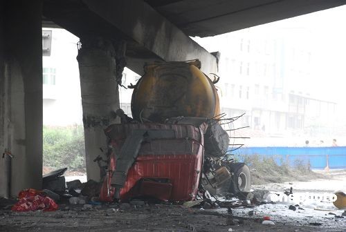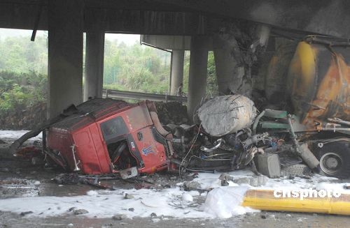 4月17日凌晨5時(shí)左右,一輛廣東牌照的水泥罐車在湖南境內(nèi)郴資桂高等級(jí)公路上釀交通事故,將京珠高速479KM+200M處橫跨郴資桂高等級(jí)公路的立交橋橋墩撞斷,造成2人當(dāng)場(chǎng)死亡,1人受傷。截止當(dāng)日下午,京珠高速?gòu)哪贤钡能囕v仍需繞道事故路段,走107國(guó)道至郴州再上高速。中新社發(fā) 李銀明 攝