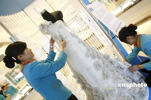 4月26日,世界上僅三件的鉑金婚紗之一亮相北京國華商場(chǎng),上面墜滿了由鉑金絲線和鉑金珠子縫制的白色花朵,吸引不少顧客的目光。這件價(jià)值75萬美元(約合500多萬人民幣)的“金貴”婚紗,是由國際鉑金協(xié)會(huì)邀請(qǐng)世界著名設(shè)計(jì)師Vivienne Tam經(jīng)過近一年時(shí)間的創(chuàng)作完成,她巧妙地將中西文化相融合,大膽地將中國的國花——牡丹作為創(chuàng)意元素。圖為工作人員正在整理鉑金婚紗。中新社發(fā) 鄭雄增 攝