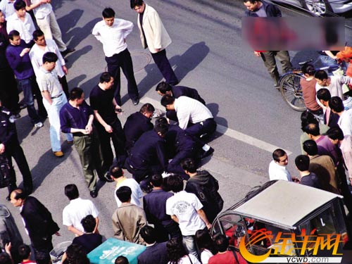 來到路邊,該男子連著打了兩輛出租車都被拒絕,正當他準備打第三輛的時候,突然一只“飛腳”從背后將他踹倒在地。據(jù)目擊者劉先生稱,隨著該男子倒地,周圍一群人和民警迅速將他摁住,立即扭住了他拿槍的那只手,隨后給他戴上了手銬,押上了警車。