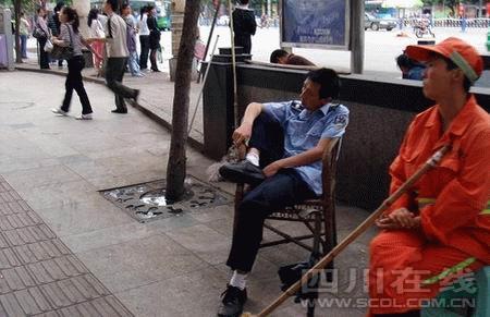 昨日(5日),照片里的主角,宜賓市(四川)翠屏區(qū)市容管理局南城中隊協(xié)管員李劍勇表示,單位領(lǐng)導(dǎo)已批評教育他了,自己影響了宜賓和宜賓城管的形象,他表示非常抱歉!爱(dāng)時所有的攤點都已規(guī)范位置了,想坐著休息下!崩顒τ抡f,城管協(xié)管員沒有固定工作點,他便在游攤最易出現(xiàn)的南門橋頭坐著休息會兒,他希望所有的城管隊員都將他作為反面教材,在以后的工作中注意紀(jì)律和形象。