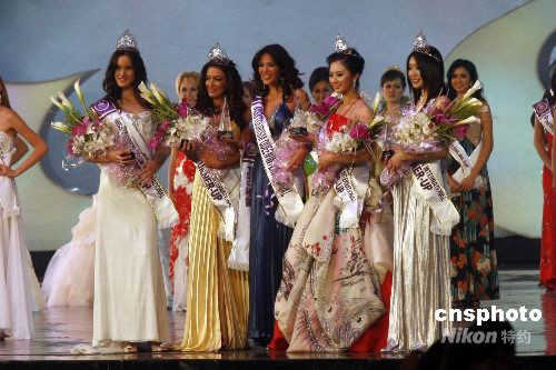 4月10日晚,2008國際旅游小姐冠軍總決賽暨頒獎晚會在河南鄭州隆重舉行。秘魯小姐Silvia Vanessa (中)獲得本年度國際旅游小姐冠軍。代表中國參賽、浙江傳媒大學一年級的大學生童鶴(右二)和加拿大小姐Sahar Biniaz (左二)分獲亞軍和季軍。中新社發(fā) 慎重 攝