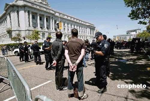 當(dāng)?shù)貢r(shí)間5月26日,美國(guó)加州最高法院宣布,維持去年十一月四日加州選民通過(guò)的禁止同性戀者結(jié)婚的八號(hào)提案。法院同時(shí)裁決,十一月四日前領(lǐng)取結(jié)婚證書(shū)的一萬(wàn)八千余對(duì)同性戀者婚姻合法。最高法院的裁決引起同性戀支持者的強(qiáng)烈不滿(mǎn),他們?cè)谑懈髲B前的十字路口靜坐示威,阻擋交通長(zhǎng)達(dá)數(shù)小時(shí),警方最后逮捕了一百五十余人。中新社發(fā) 陳鋼 攝