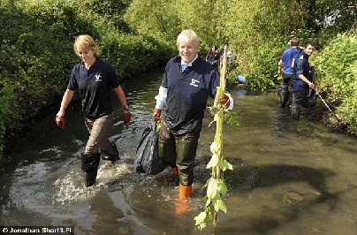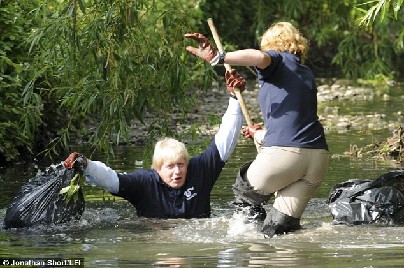 約翰遜當(dāng)時(shí)正在和志愿者們一同為倫敦東南部的普利河清除垃圾,穿著防水長(zhǎng)靴、戴著橡膠手套的他在靠近岸邊的淺水區(qū)忙得不亦樂乎。在攝像機(jī)面前擺出各種姿勢(shì)后,約翰遜突然被一個(gè)水洼絆倒,并跌倒在河水中。3名志愿者見勢(shì)沖了過去,用一根竹竿奮力將他拖出水面。