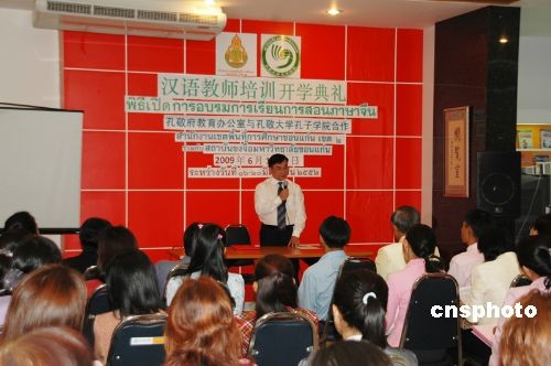 6月16日,泰國孔敬大學(xué)孔子學(xué)院與泰國孔敬府教育辦公室合作舉辦的第六屆漢語教師培訓(xùn)班在泰國開班。這是孔敬大學(xué)孔子學(xué)院和孔敬府教育辦公室在今年的第二次合作,是一次特殊的漢語教師培訓(xùn)。以往的教師培訓(xùn)都是在假期進(jìn)行,應(yīng)孔敬府教育辦公室對提高教師們的漢語水平的迫切需要,孔子學(xué)院在新學(xué)期剛開始就為孔敬府各區(qū)縣的中小學(xué)教師開設(shè)教師漢語培訓(xùn)課程。來自孔子學(xué)院的領(lǐng)導(dǎo)、老師、志愿者,孔敬府教育辦公室領(lǐng)導(dǎo)及孔敬府各區(qū)縣19所中學(xué)校的40名教師參加了這次開學(xué)典禮。中新社發(fā) 顧時宏 攝