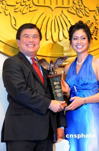 七月二十三日晚,國際領(lǐng)袖基金會在華盛頓舉行頒獎(jiǎng)晚會,在美國國會中僅有的兩名華裔議員吳振偉、趙美心分別獲得“年度杰出公職服務(wù)獎(jiǎng)”。圖為美國首位華裔眾議員吳振偉領(lǐng)取“年度杰出公職服務(wù)獎(jiǎng)”。國際領(lǐng)袖基金會為全美最著名的亞裔青年領(lǐng)袖訓(xùn)練機(jī)構(gòu),每年定期表揚(yáng)促進(jìn)國際經(jīng)貿(mào)繁榮、發(fā)揚(yáng)中華文化傳承有卓越成就的杰出人士。中新社發(fā) 吳慶才 攝