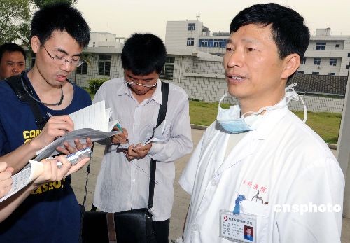 6月1日,福州市肺科醫(yī)院副院長林鐘軒(右)在接受記者采訪時表示:福建省第四例甲型H1N1流感患者經(jīng)過治療目前病情有所好轉(zhuǎn)。該患者,男,22歲,美國籍,在美國一企業(yè)工作。5月26日從紐約乘機經(jīng)溫哥華至香港,在香港轉(zhuǎn)乘KA660航班,北京時間28日上午抵達(dá)福州長樂國際機場。30日上午因發(fā)熱、咳嗽就診連江縣琯頭衛(wèi)生院,測體溫38.3℃。31日凌晨轉(zhuǎn)至福州肺科醫(yī)院隔離治療,入院測體溫39.3℃,伴咳嗽、頭痛、咽痛等流感樣癥狀。30日晚上福州市疾病預(yù)防控制中心對患者鼻咽拭子標(biāo)本進行了檢測,結(jié)果為甲型H1N1流感病毒核酸陽性。省衛(wèi)生廳專家組根據(jù)患者的臨床表現(xiàn)、流行病學(xué)史和實驗室檢測結(jié)果,按照衛(wèi)生部制定的診療方案,判定該病例為甲型H1N1流感確診病例。相關(guān)情況已經(jīng)報告衛(wèi)生部。中新社發(fā) 劉可耕 攝