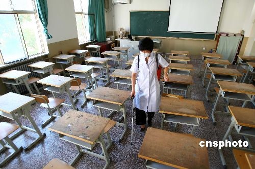 6月22日周一,北京市海淀區(qū)二里溝中心小學(xué)的老師在同學(xué)到來(lái)之前為校室進(jìn)行全面的消毒,嚴(yán)防甲型H1N1。近日,針對(duì)甲型H1N1流感警戒級(jí)別升至6級(jí),北京市衛(wèi)生局、教委聯(lián)合印發(fā)《北京市學(xué)校傳染病防控工作管理指導(dǎo)意見(jiàn)》,北京市各學(xué)校須每周至少對(duì)教室、走廊等處所消毒一次,在特殊時(shí)期要每日消毒。中新社發(fā) 富田 攝