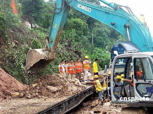 經(jīng)過上千名鐵路職工和武警官兵24小時不間斷搶修,暴雨天氣引發(fā)巖石崩塌而被迫中斷的滬昆鐵路,在中斷40小時后于2009年7月8日7時18分恢復(fù)通車。