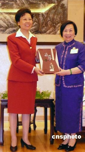 7月8日,中華全國(guó)婦女聯(lián)合會(huì)副主席黃晴宜(左)來(lái)到臺(tái)北,隨后前往臺(tái)灣中華婦聯(lián)總會(huì)拜會(huì)該會(huì)主委辜嚴(yán)倬云女士。全國(guó)婦聯(lián)此行是建會(huì)60年來(lái)首次組大型代表團(tuán)到臺(tái)灣訪問(wèn),辜嚴(yán)倬云曾于2年前率臺(tái)灣中華婦聯(lián)總會(huì)到北京訪問(wèn)。圖為雙方致贈(zèng)紀(jì)念禮物。中新社發(fā) 劉舒凌 攝