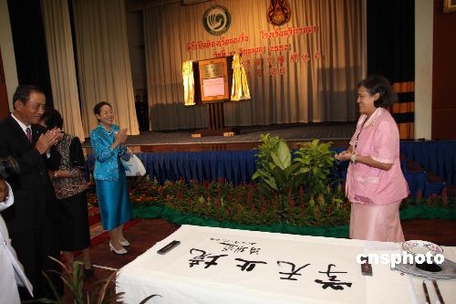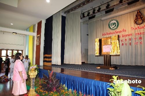 六月十二日的泰國(guó)吉拉達(dá)學(xué)校古老校園里洋溢著濃郁的中國(guó)文化氣息。在喧天的鑼鼓聲中,泰國(guó)瑪哈扎克里·詩(shī)琳通公主殿下按動(dòng)電鈕,寫有“吉拉達(dá)學(xué)?鬃诱n堂”的牌匾徐徐拉開帷幕,標(biāo)志著泰國(guó)第七家孔子課堂正式落戶這個(gè)坐落于泰國(guó)王宮里的學(xué)校。揭牌儀式上,詩(shī)琳通公主還興致勃勃地重酌墨水,揮毫為孔子課堂題寫了“學(xué)無止境 ”四個(gè)漢字,并勉勵(lì)泰國(guó)各孔子學(xué)院、孔子課堂擔(dān)當(dāng)起推動(dòng)泰國(guó)漢語(yǔ)教學(xué)進(jìn)步、促進(jìn)中泰友好關(guān)系發(fā)展的重任。中新社發(fā) 顧時(shí)宏 攝
