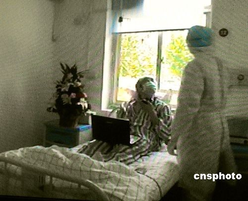 五月十三日中午,在山東省城濟(jì)南市傳染病醫(yī)院接受治療的輸入性甲型H1N1流感疑似患者呂某某目前身體、精神各情況已基本恢復(fù)。疑似患者呂某某在十一日晚剛從濟(jì)南火車站下車時(shí)體溫一度高達(dá)三十八點(diǎn)九攝氏度。經(jīng)過(guò)濟(jì)南市傳染病醫(yī)院的醫(yī)護(hù)治療,體溫已降至三十六點(diǎn)七攝氏度。圖為記者從醫(yī)院監(jiān)控系統(tǒng)的電視屏幕上拍到的患者正在與醫(yī)生交談。中新社發(fā) 張璐 攝